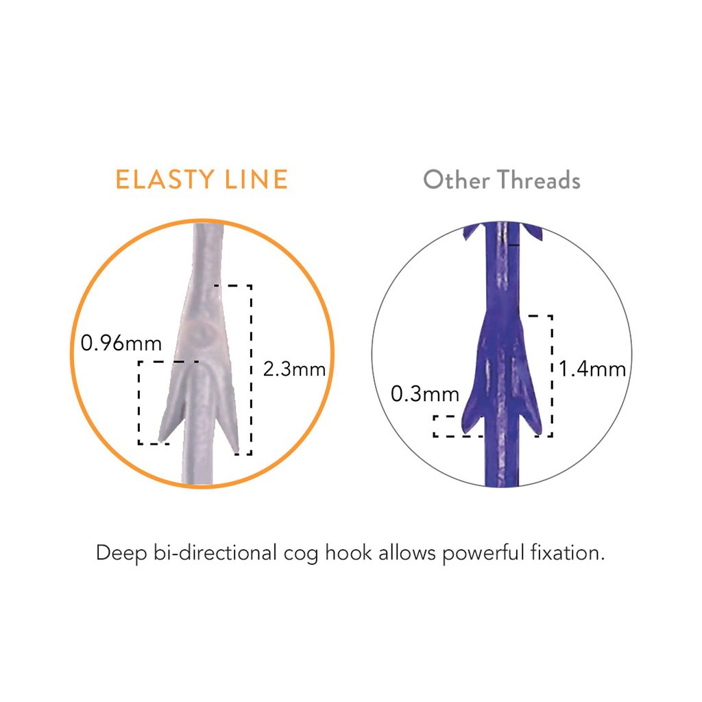 Elasty Line is the highest tensile strength thread available, featuring a dual coating and a heatless press sculpting method that forms deep bi-directional cogs. This special coated high polymer PDO thread includes an anchor at the tip of the FCV cannula, providing strong and precise fixation. It is manufactured through a specific press sculpting process without heat treatment.